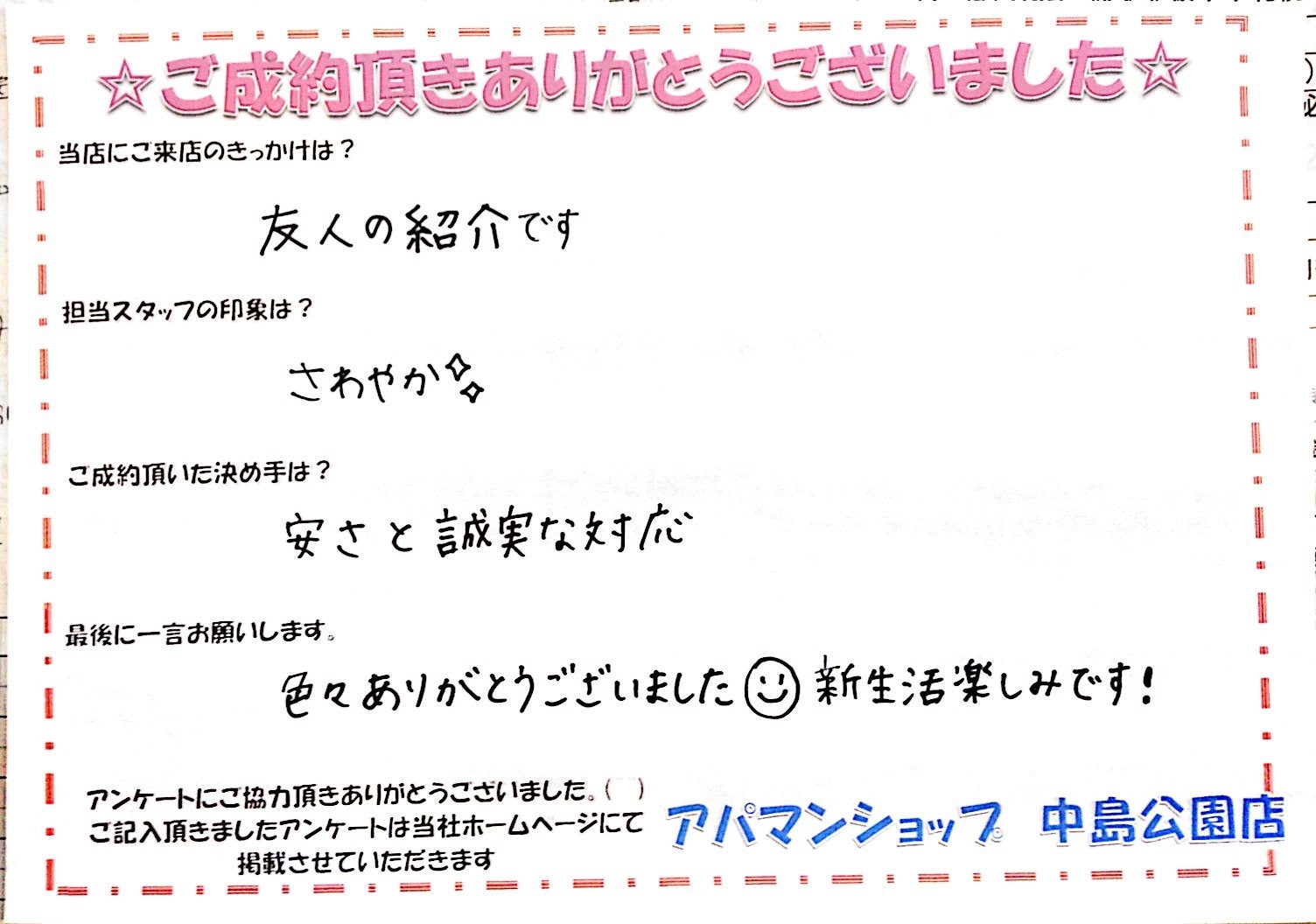 【ご成約頂いたお客様の声】アパマンショップ 札幌 賃貸事業部 中島公園店中島公園店札幌大通店 フリーダイヤル 0120-982-736にてご成約