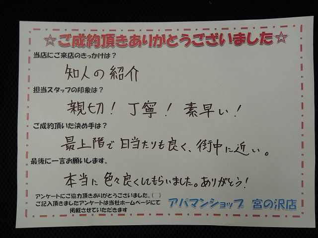【ご成約頂いたお客様の声】アパマンショップ 札幌 賃貸事業部 宮の沢店宮の沢店 フリーダイヤル 0120-958-051にてご成約