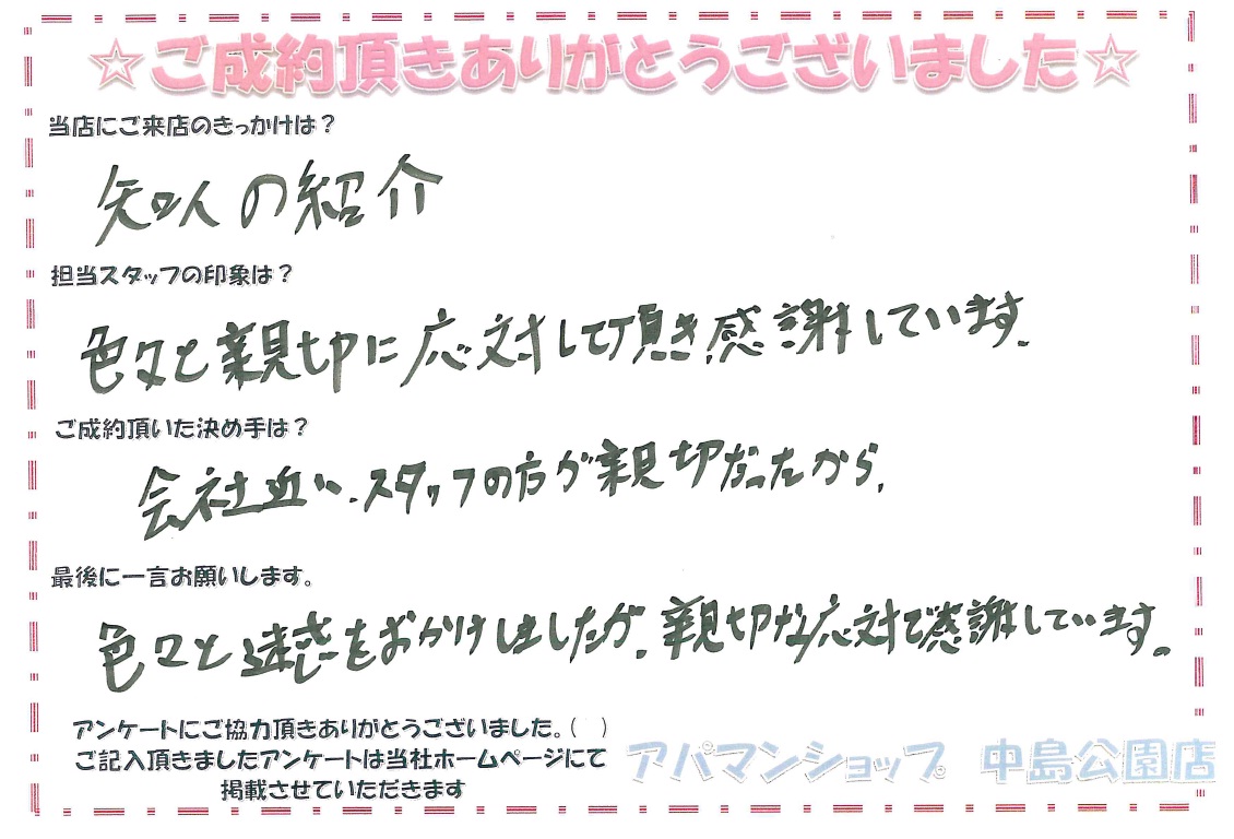 【ご成約頂いたお客様の声】札幌 賃貸事業部 アパマンショップ 中島公園店札幌大通店 フリーダイヤル 0120-982-736にてご成約